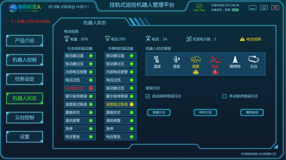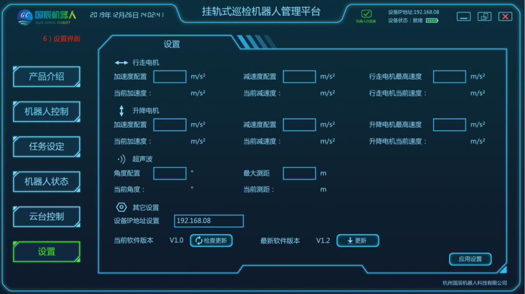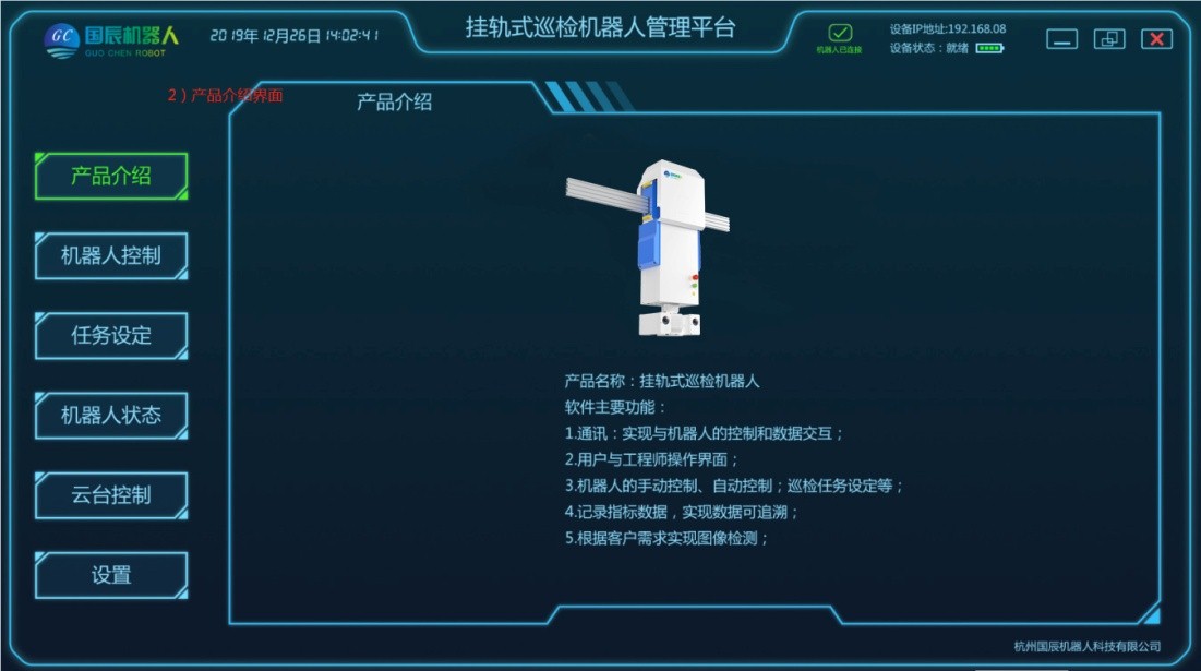 項目主要由移動機器人本體、軌道系統(tǒng)、采集設(shè)備、定位系統(tǒng)、供電和通信系統(tǒng)、后臺系統(tǒng)等結(jié)構(gòu)組成。在巡檢工作過程中,由用戶設(shè)定任務(wù)點,加裝采集設(shè)備,移動機器人根據(jù)控制指令在軌道上運動,將采集設(shè)備運送到指定位置采集數(shù)據(jù),且滿足所需要的負(fù)載量,速度;在機器人行駛過程中可實現(xiàn)自主爬坡、采集設(shè)備可根據(jù)監(jiān)測物體高度進行升降調(diào)整等功能;配套的調(diào)試軟件支持手動、控制移動平臺運動;具有較強的適用性及拓展性,可自定義模塊搭配,自主設(shè)定任務(wù)點,自動巡檢、定點采集、自動充電等功能。