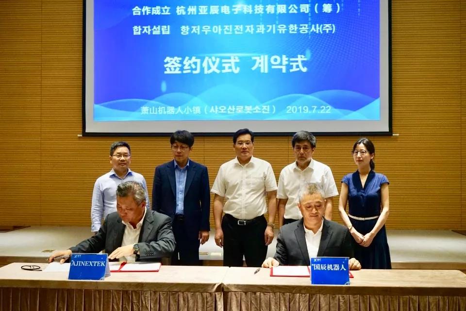 【國辰訊】2019年7月22日,杭州國辰機器人科技有限公司與韓國(株)亞進EXTEK合作成立合資公司簽約儀式在蕭山機器人小鎮(zhèn)隆重舉行。蕭山經濟技術開發(fā)區(qū)黨工委委員、管委會副主任徐建中,開發(fā)區(qū)招商局副局長、機器人小鎮(zhèn)工作組負責人陳笑,浙江省機器人產業(yè)發(fā)展協(xié)會秘書長王國耀,韓國大慶機器人振興社會長金昌浩,杭州國辰機器人科技有限公司首席戰(zhàn)略官王國成、韓國(株)亞進EXTEK常務崔成赫等出席簽約儀式。